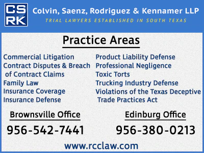 Colvin, Saenz, Rodriguez & Kennamer, L.L.P., a leading South Texas law firm, has earned a strong reputation as civil litigators, particularly in the areas of products liability law, labor and employment law, insurance coverage, toxic torts, professional malpractice and general negligence.